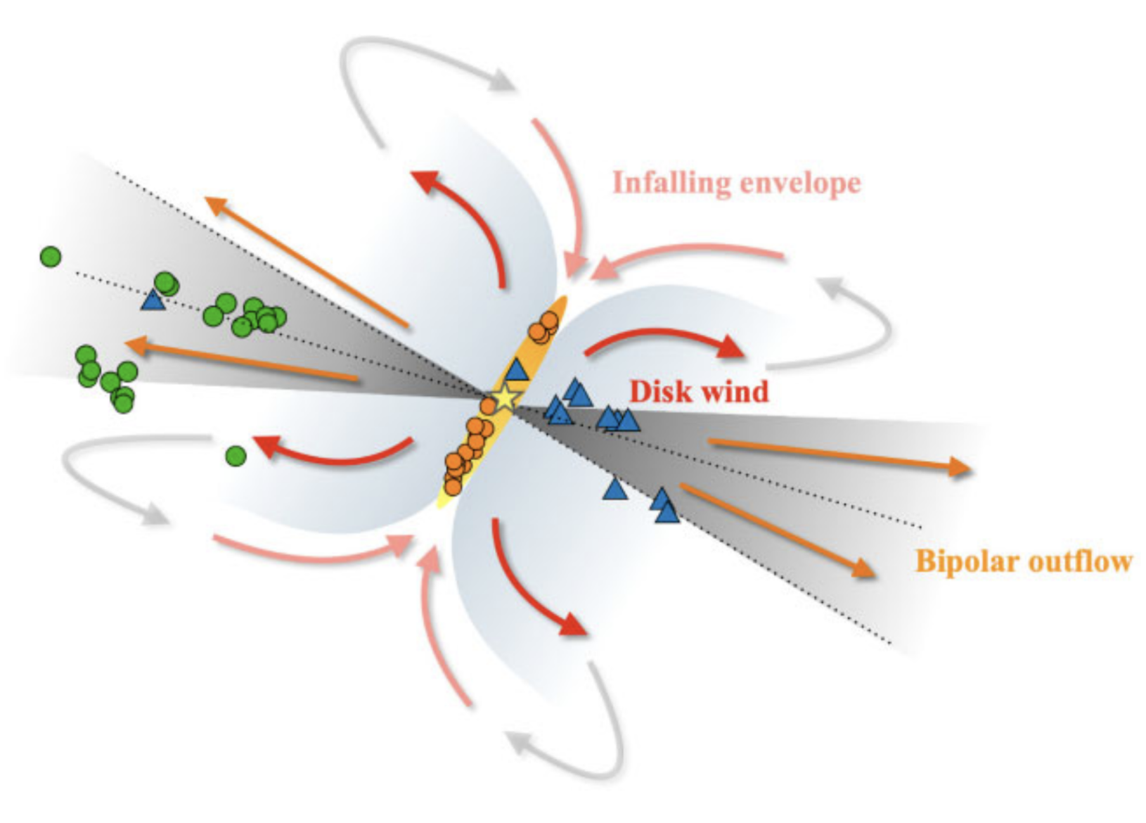 In context, the variety of structures and clusters of the eastern and western methanol and water masers provides evidence for: 1) a bipolar outflow, traced mostly by the water masers; 2) the methanol masers in the eastern structure show some inward motions which may be explained by them being produced at the edge of the outflow and the infalling envelope; 3) the western methanol masers are perpendicular to the outflow which may indicate that they are in a rotating disc-like structure. These multi-epoch, multi-frequency observations studying the different types of maser have produced the schematic model in the figure above, which can only be performed with high-resolution high-sensitivity VLBI arrays.