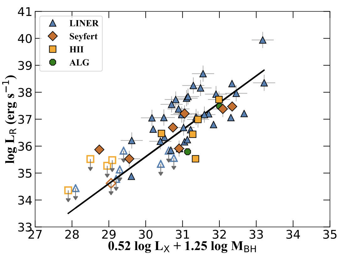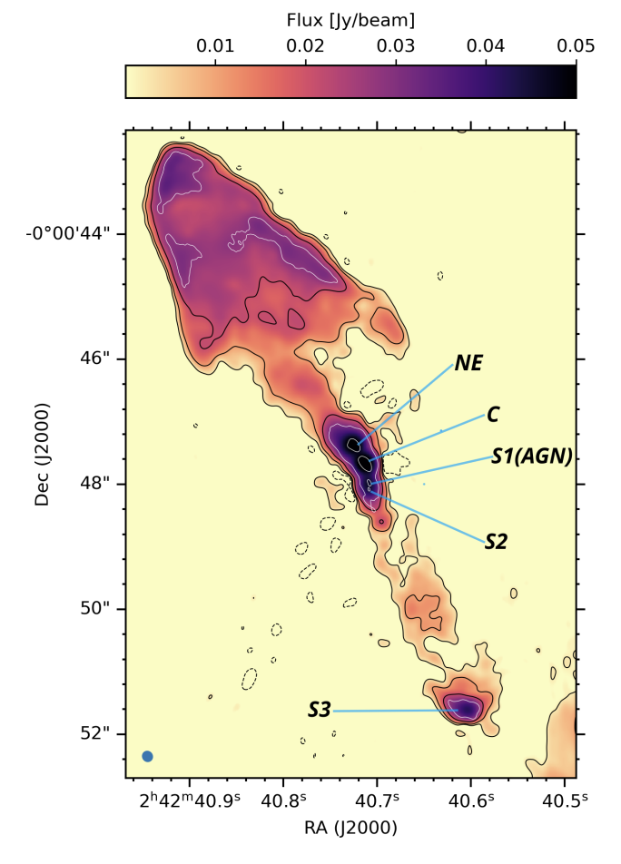 The targets showed a wide range of morphology on sub-kiloparsec scales, with compact cores, knots, extended collimated structures and more diffuse structures. Based on visual inspection only, 15/42 (35%) targets were classified as compact sources as they showed no extended radio features, 21/42 (50%) targets were classified as jet-like since they showed either one-sided jets or well collimated multiple radio components. Although there was a large variety across the sample, the team found that a significant fraction of the total radio luminosity in this sample was typically not located in the compact, sub-kiloparsec structures traced by e-MERLIN. Indeed, most targets have moderate brightness temperatures, with only 13–21 targets showing clear evidence for AGN-like values (i.e., TB 104.8 K). Previous VLA maps of the same targets showed that this resolved-away emission can be sometimes located in diffuse, loosely collimated lobes, likely associated with AGN jets or outflows.