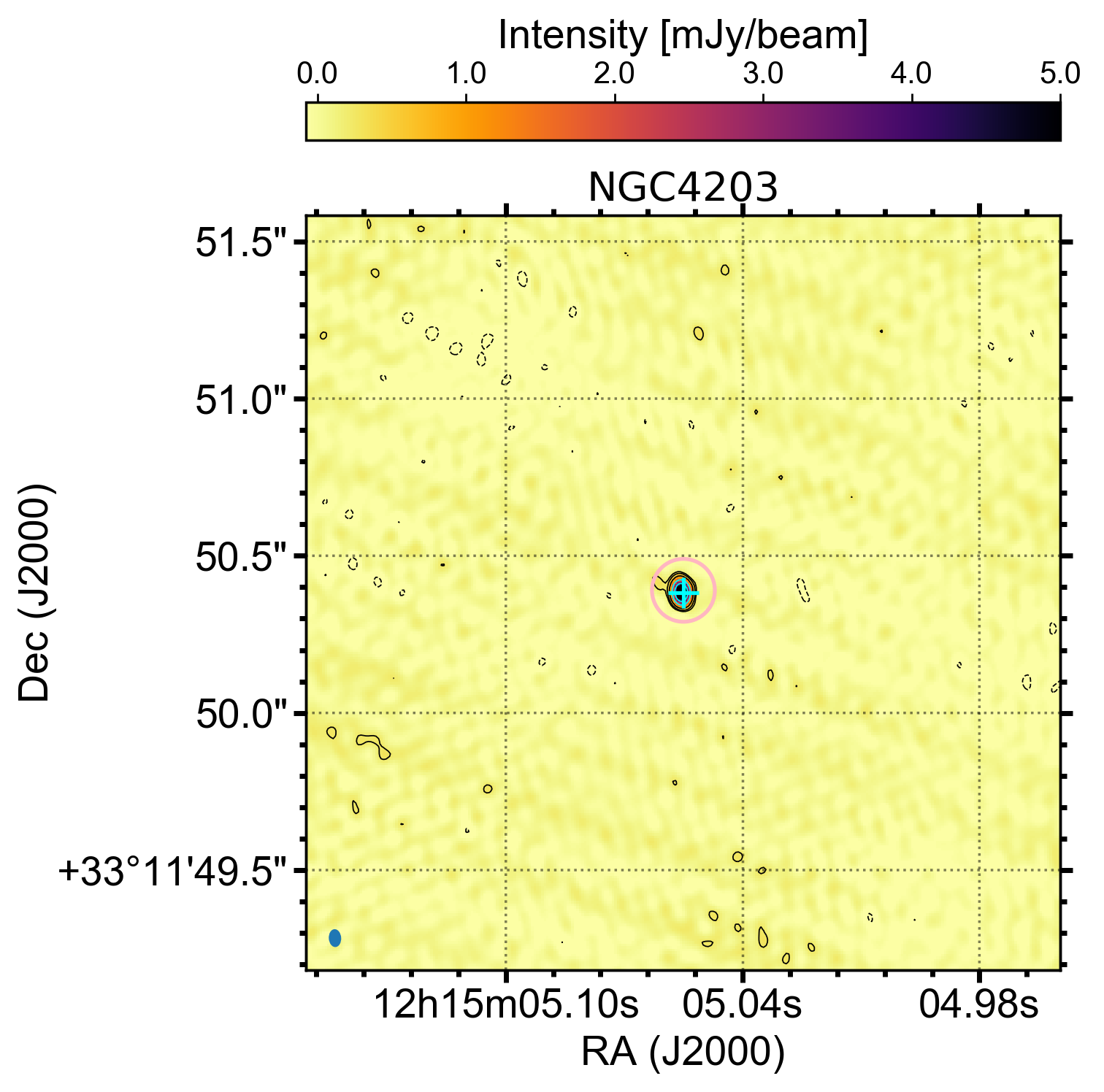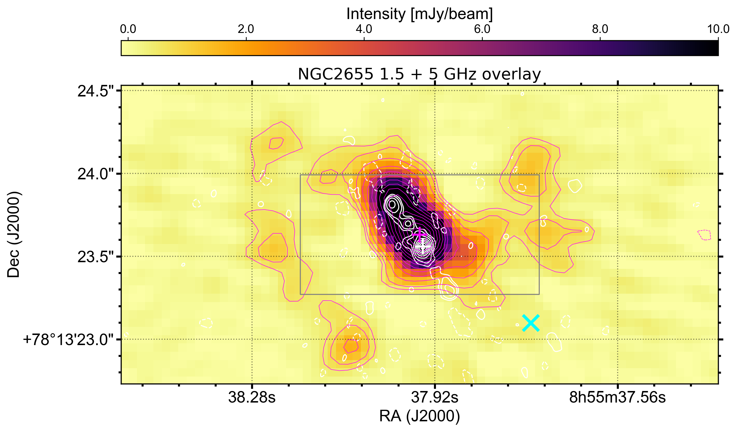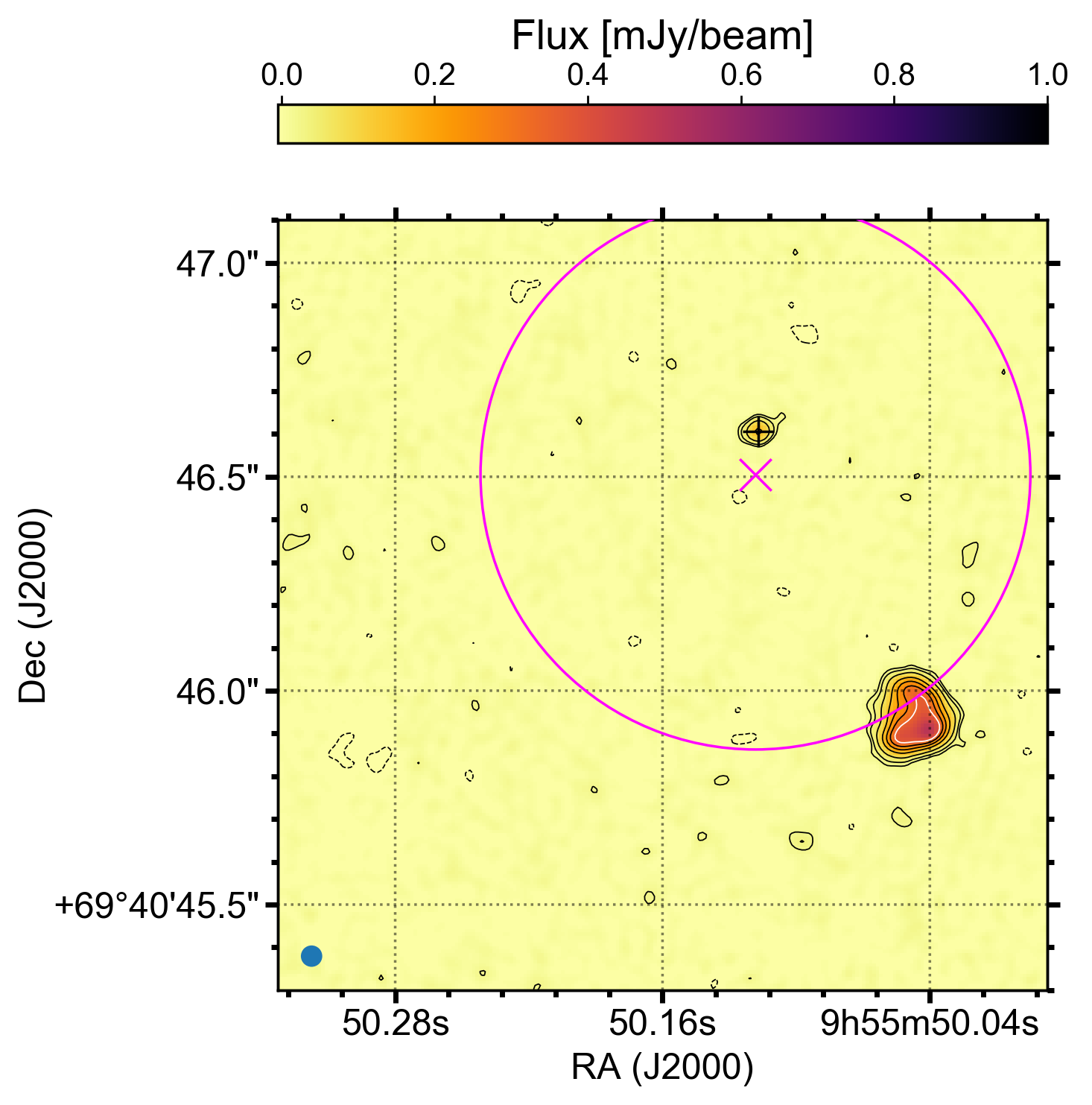 In this work, deep 5-6 GHz observations (r.m.s. sensitivity 7μJy/beam) of M82 obtained in 2015 with the e-MERLIN inteferometer detected a radio source (see image above) 0f 0.15 mJy/beam co-spatial with that of M82 X-1 (see magenta circle in image above, from Xu et al. 2015). Moreover, the source was not detected in radio data at 1.5 GHz obtained a week prior, showing the source to be highly variable on week-long timescales. The rise time of this radio source is consistent with stellar mass black holes and ULXs. Follow up e-MERLIN observations in 2016 also did not detect the source, which aligns closely with the observed X-ray behaviour, suggesting that the source has long term variability and that the radio and X-ray emission may be correlated. Further EVN+e-MERLIN data obtained in 2021 showed a fainter source of 0.05 mJy/beam co-incident with M82 X-1 (see black plus symbol in the image above), indicating that observing depth was necessary to detect it.