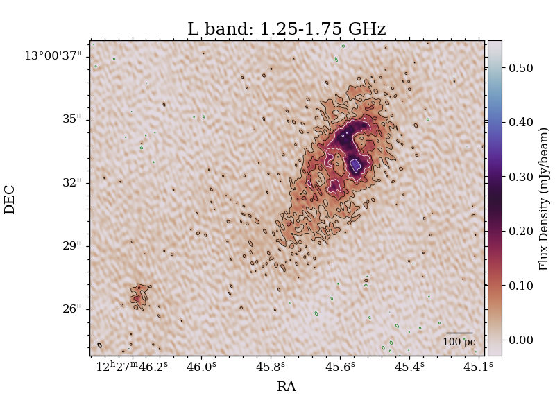 The output of the simulations was then fed into BLOB-RENDER, a tool created to generate pseudo-radio images which can then be used to model the expected sizes, shapes and fluxes of the ejecta (see Fig 3). By incorporating the uv coverage of the MeerKAT and e-MERLIN arrays, it was possible to simulate the original observations together with a real-sky background. The use of this tool enables more direct understanding and interpretation of the simulations, whilst also providing potential uses for predicting future array capabilities of e-MERLIN and other telescopes.