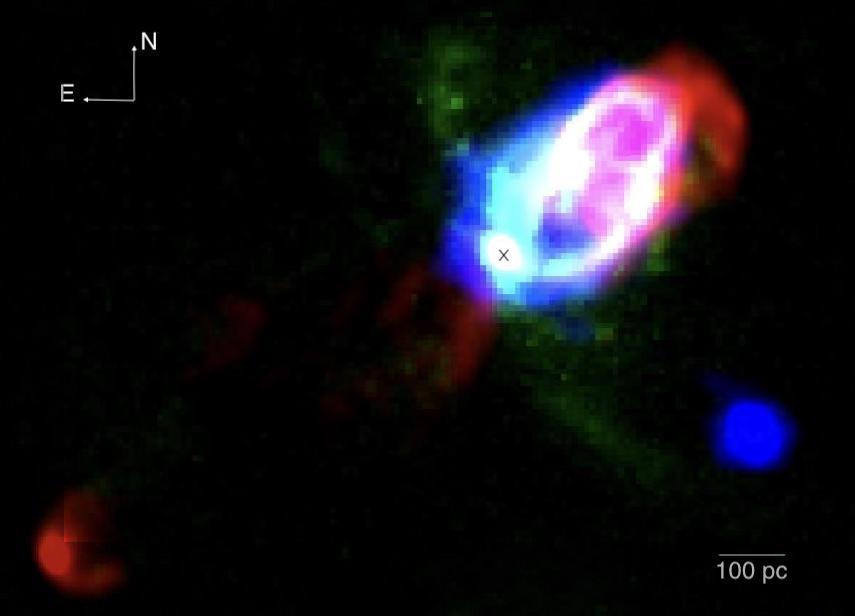 In this work by Marta Puig-Subirà from IAA-CSIC and collaborators, they combined e-MERLIN radio data with VLA, Hα line data from HST (photometry) and MEGARA/GTC (integral field spectroscopy) and X-ray data from Chandra of the LINER NGC 4438 at matched resolutions to extract information about its outflow at scales of ~25pc. The radio observations revealed non‑thermal synchrotron emission in the north‑western lobe of the galaxy, consistent with the presence of a compact radio jet. When compared to the multi-wavelength data, there is a clear overlap between the radio and Hα structures for the north-western lobe, providing evidence that the jet is likely responsible for inflating a bubble of ionised gas. They also showed radio spectral index maps, allowing the separation between the nucleus (flat spectra) and the outflowing material compatible with non‑thermal synchrotron emission), and measured energy output in the radio jet, which is three orders of magnitude more powerful than the power of the outflow. These results highlight that in NGC 4438, the jet is inflating a bubble and driving feedback in the central region of the galaxy.