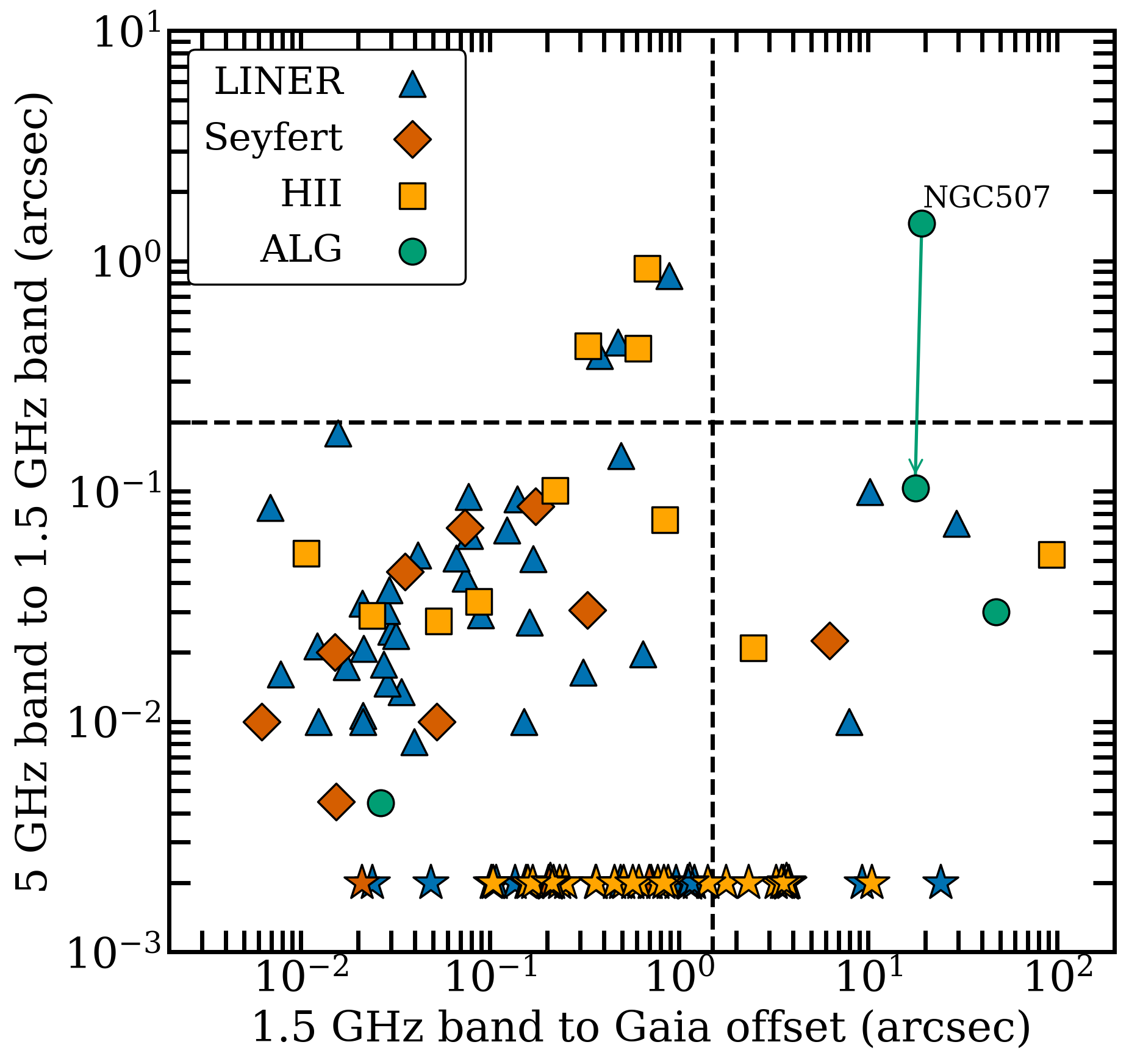 The improved spatial resolution also offers valuable constraints on the nature of nuclear activity in galaxies previously labelled as “inactive.” Even among HII and absorption‑line systems, 8% show compact C‑band detections, strengthening the idea that weakly accreting black holes may be far more common than previously thought. As expected, comparisons with earlier 1.5 GHz data reveal that many sources become more compact at 5 GHz, suggesting that the C‑band emission traces the innermost jet regions rather than extended relic structures. However, there were some notable cases where the L and C band positions were offset from the gaia positions, possibly due to misidentification of the nucleus in either the previous L-band maps, or contamination from non-AGN in the gaia catalogue. The L-band and C‑band imaging provides the most definitive radio evidence yet that a notable fraction — perhaps up to 30% — of local galaxies host a radio‑active nucleus.