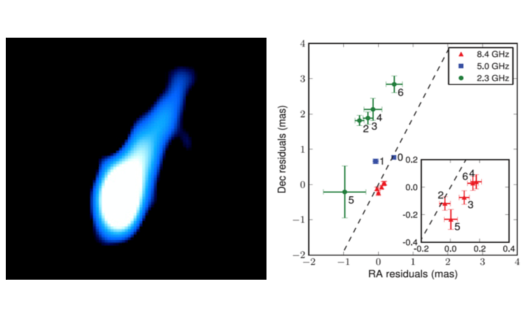 Fig. (Left) The one-sided jet of Cygnus X-1 that is always seen in the hard X-ray state as observed with the VLBA at 8.4 GHz. (Right) Astrometric VLBI positions of the unresolved core taken during the soft X-ray state. Although the jet appears quenched during the soft state, residual motion of the core clearly shows the source to move along the jet axis.
